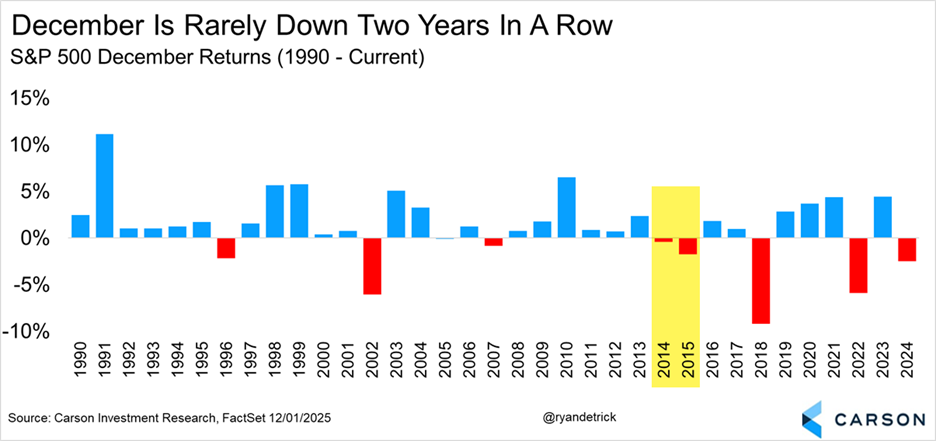 12月の米国株が2年連続下落するのは稀である。去年の12月は下落した。アノマリーで見れば、今年も下落する可能性は低い。大きく下落した2018年の12月は、FRBが利下げを拒否した。