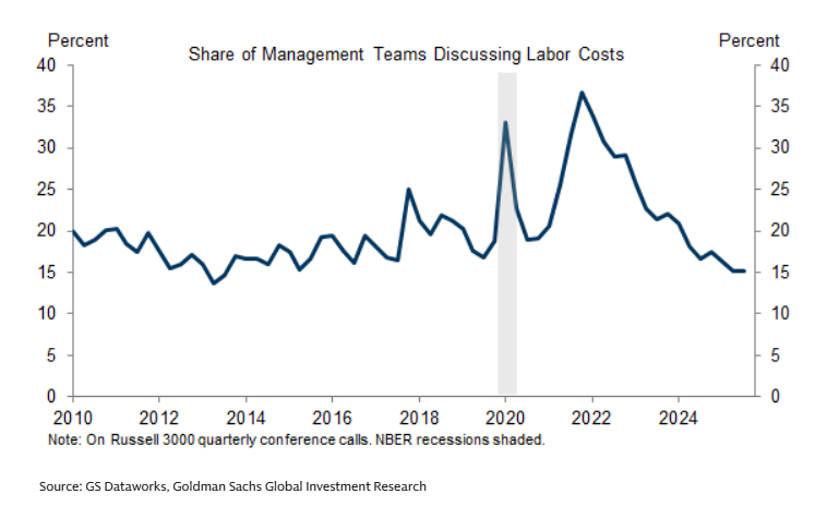 決算説明会にて、労働コストについて言及する企業は、わずか15%にまで低下している。言及する時は、大抵、労働コストが上昇している時だ。労働コストが低下して、利益率が上昇していますなんて、口が裂けても言えない。