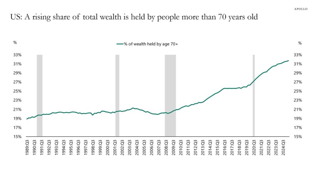 いまや、米国の家計部門における総資産のうち、70歳以上の人々が所有する割合は32%に達している。