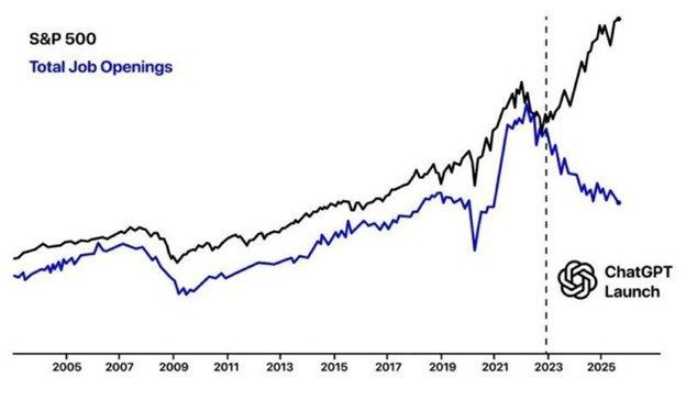 ChatGPTの出現以降、株価は実体経済(労働市場)から乖離している。労働市場の更なる崩壊=景気後退が起きれば、この乖離がもたらすのは想像以上に悲惨な結果か。