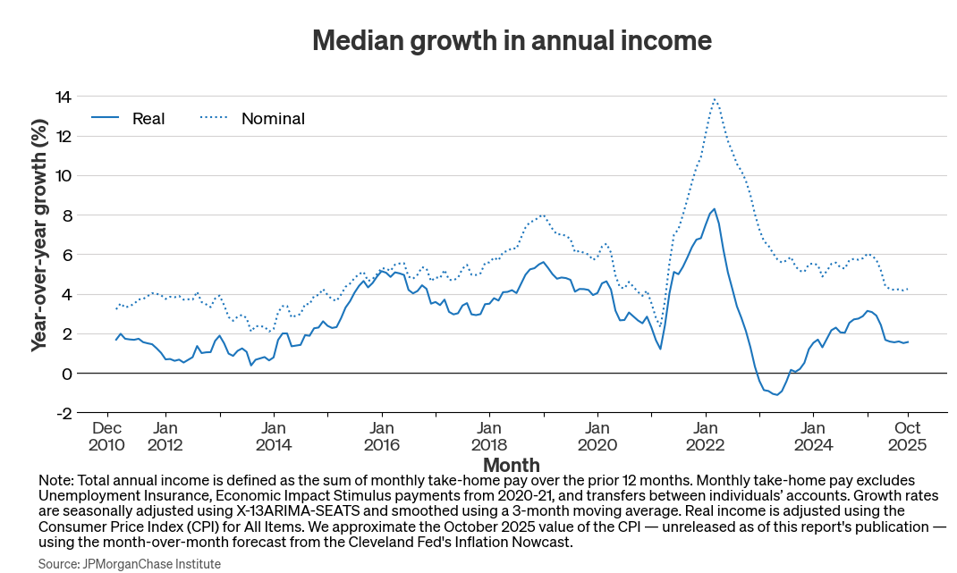 JPモルガン:25歳から54歳まで(いわゆるプライムエイジ)のインフレ調整後実質所得の伸び率は、足元1.6%である。実質所得の中央値の伸びは、2025年初頭に低下し、10月時点では2010年代初頭の労働市場が低迷していた時期(当時の失業率は平均7%)の水準に近い。