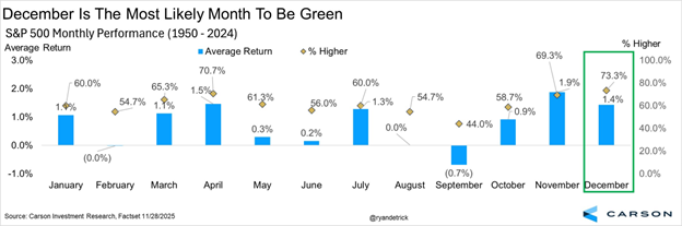 12月は利益が出る可能性が最も高い月であり、S&P 500は73%以上の確率で上昇している。