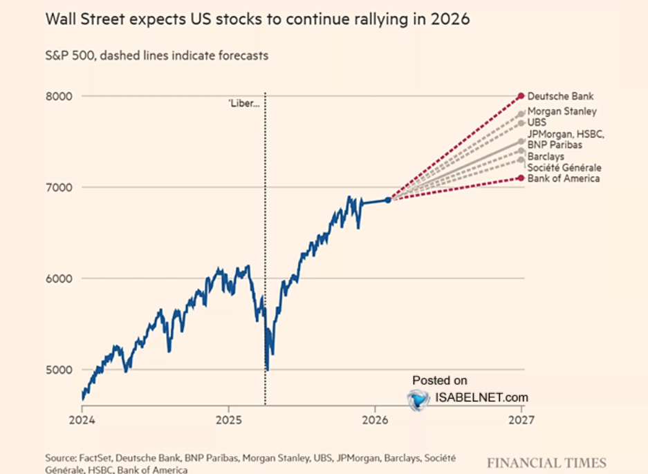 どの金融機関も、来年2026年は株価上昇前提である。レンジは7000から8000で、ドイツ銀行が最も強気だ。
