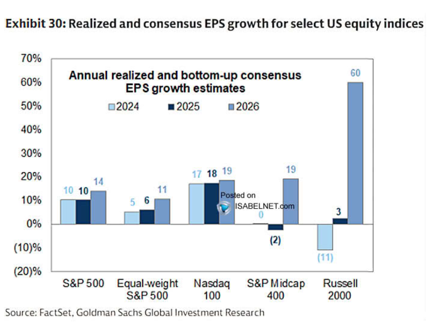 ゴールドマンサックス:S&P500のEPSは、2026年に14%増益予想。しかし注目すべきはラッセル2000、60%の増益予想となっており、ファンダメンタルで見れば来年の主役になる可能性がある。大幅増益予想の背景にあるのはトランプ減税。
