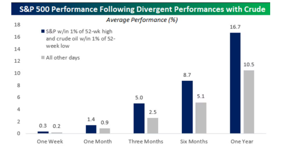株価と原油価格はともに経済の先行きを計る体温計である。しかしたまに、真逆の動きをすることがある。今がそうだ。どちらが正しいのかというと、ほとんどの場合で株価が正しい。チャートは、S%P500が52週高値から1%以内、原油価格が52週安値から1%以内に位置している時、そこから1週間後、1か月後、3か月後、6か月後、1年後のS&P500の平均パフォーマンスを青色のグラフで示している。灰色のグラフは、それ以外の時の平均パフォーマンスだ。株価は原油安(インフレを抑えてくれる)を追い風に、好パフォーマンスを記録している。違う動きをすれば、株価を信じたほうがいいかもしれない。
