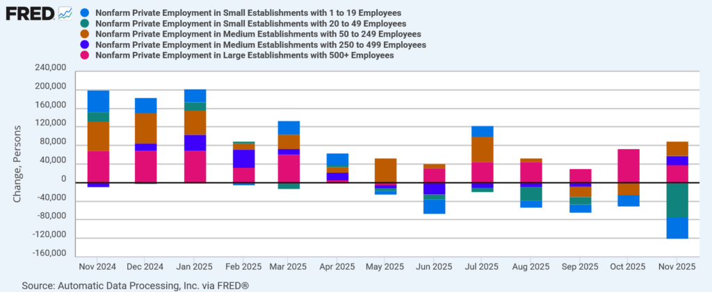 11月のADP雇用者数は予想外の純減に。米国労働市場は依然軟化傾向、利下げ期待は高まる結果に。注目は純減要因で、従業員50人以下の中小企業の雇用者数が大幅に減少した一方で、中堅・大企業は増加した。中小企業が苦しんでいる状況、消費者だけでなく企業にもK字経済は表れている。