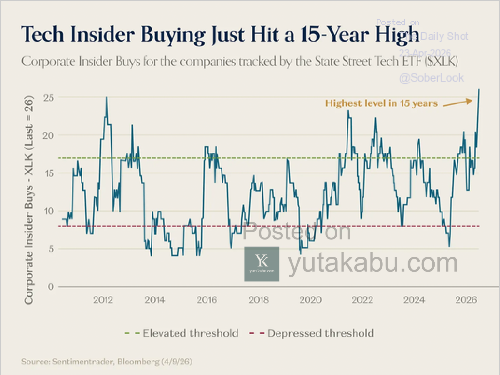 このチャートは、米国のテクノロジーセクター($XLK)におけるインサイダーの買い意欲を可視化したものです。2026年4月、この指標は過去15年間で最も高い水準を記録しました。企業の役員や大株主が一斉に自社株を買い入れている事実は、非常に強力なシグナルです。これは、現在のテック企業の収益力や将来性が、極めて強固であることを直接的に裏付けています。内部事情に精通した彼らが私財を投じる背景には、事業の成長性に対する揺るぎない自信があります。現在のファンダメンタルズが極めて健全であるという確信が、この歴史的な数値に現れていると言えます。セクター全体の底力と価値を証明する、非常にポジティブなデータであることは間違いありません。