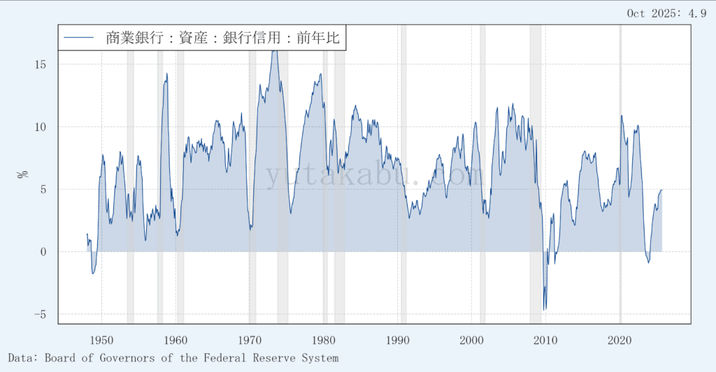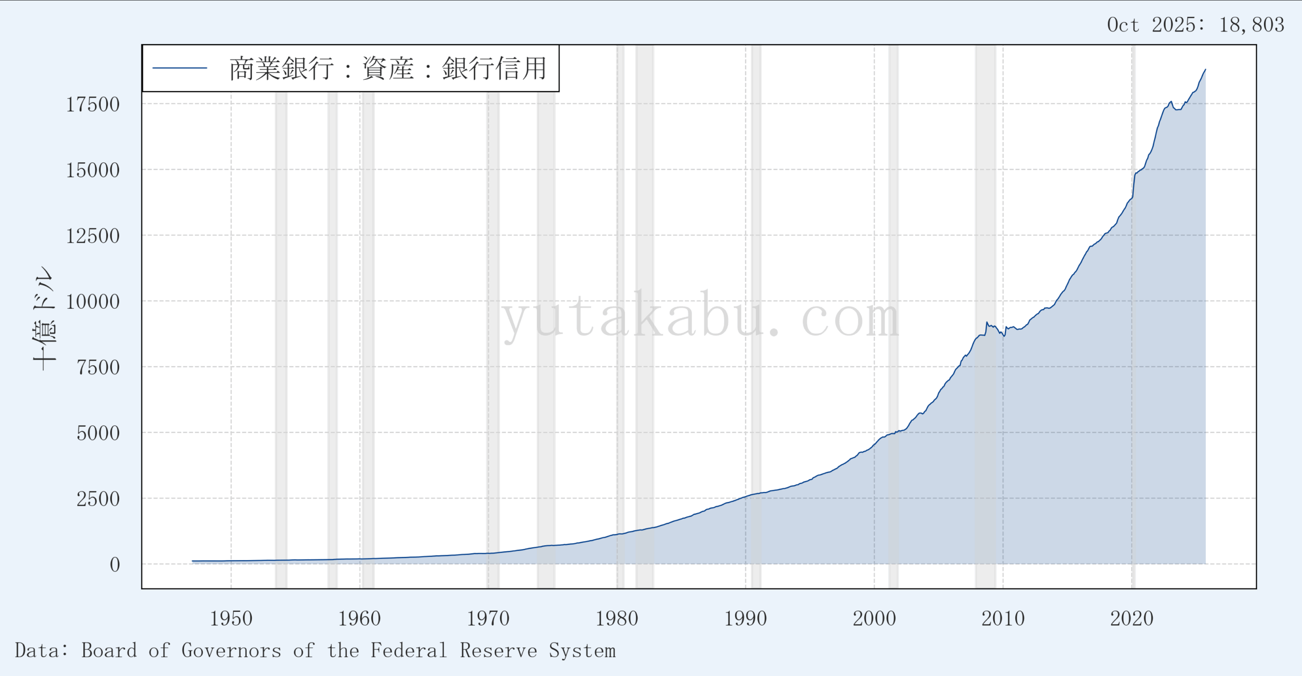米国商業銀行が保有する貸出と証券投資を合算した銀行信用の総量を示す指標。その推移は銀行部門が経済に供給するクレジットの拡大・縮小を示し、信用環境・景気循環・金融政策の影響を分析する基礎となる。