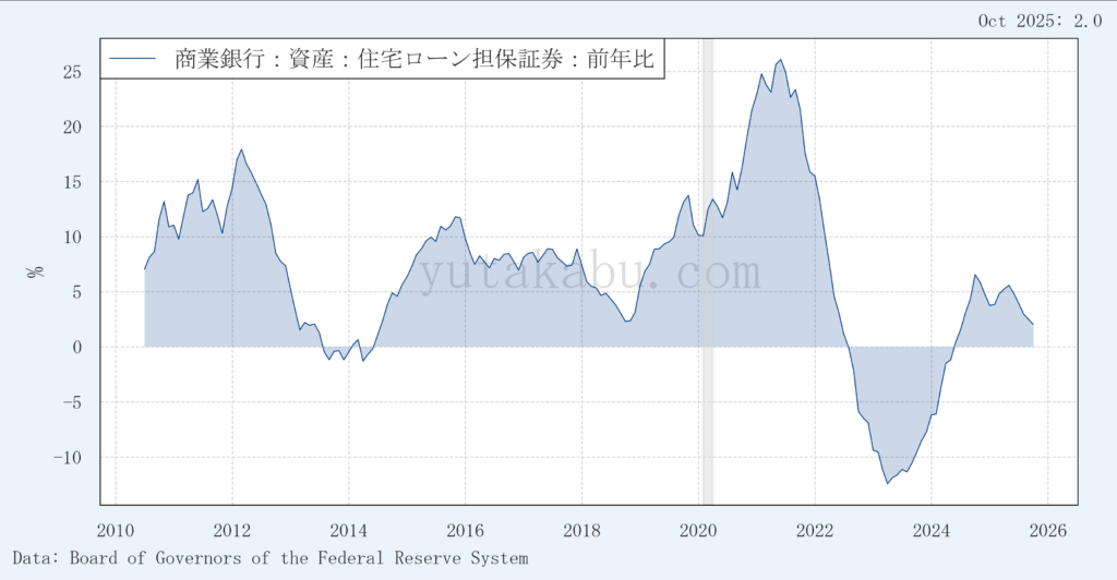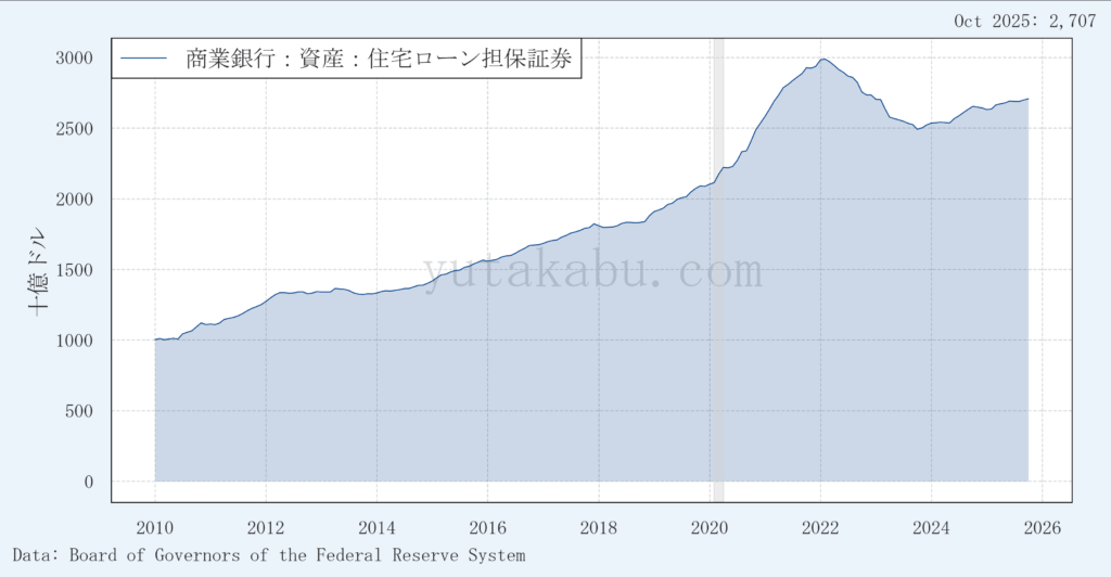 米国商業銀行が保有する国債・政府系機関証券のうち、住宅ローン担保証券(MBS:Mortgage-Backed Securities)にあたる保有額を示す指標。この数値の推移は、銀行のバランスシートにおける住宅ローン証券へのエクスポージャー変化および金利環境や流動性条件の変化に対する銀行の対応を分析するうえで利用される。