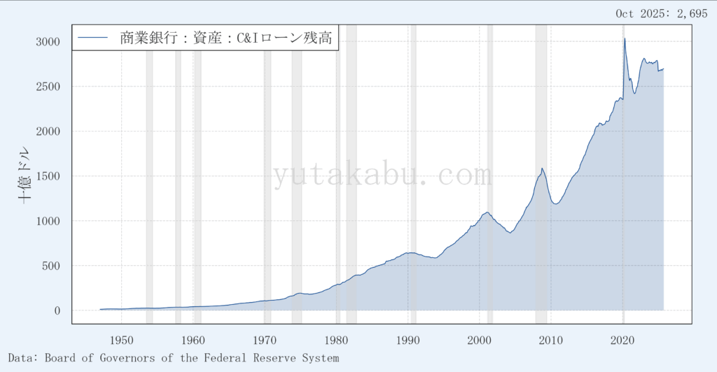 米国商業銀行が企業向けに提供する商業・産業向け貸出(C&Iローン)の残高を示す指標。その推移は企業の資金需要や銀行の与信姿勢の変化を示し、景気動向・信用サイクル・金融政策の影響を分析する基礎となる。