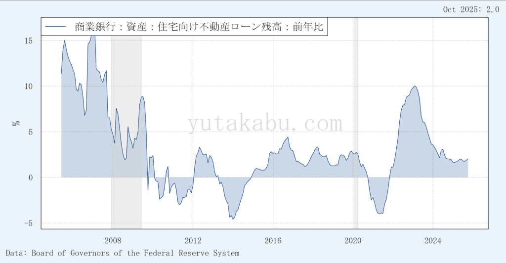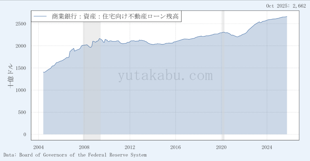 米国商業銀行が保有する不動産関連貸出のうち、住宅向け不動産ローン(Residential Real Estate Loans)の残高を示す指標。その推移は住宅市場の需要動向や銀行の住宅ローン供給姿勢の変化を示し、金利環境・家計部門の信用状況・不動産市場の景気循環を分析する基礎となる。