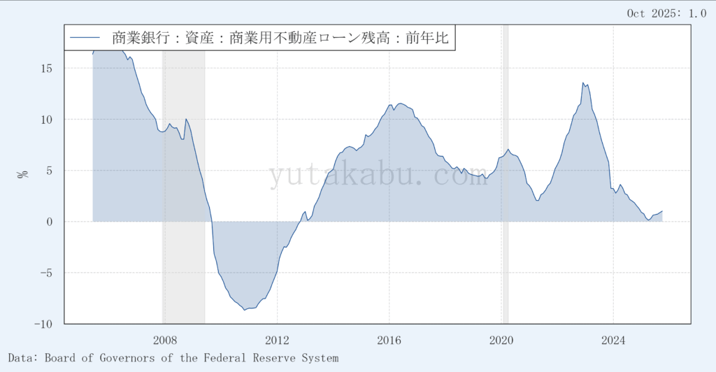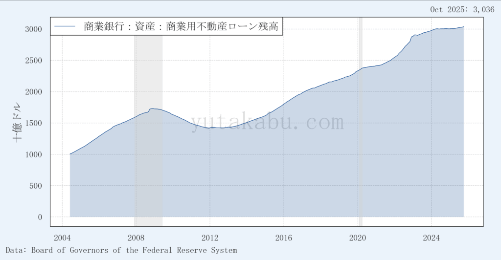米国商業銀行が保有する不動産関連貸出のうち、商業用不動産ローン(Commercial Real Estate Loans)の残高を示す指標。その推移はオフィス・小売・工業用施設など商業不動産市場への銀行のエクスポージャー変化を示し、地域銀行のリスク動向や不動産市況および金融環境の影響を分析する基礎となる。