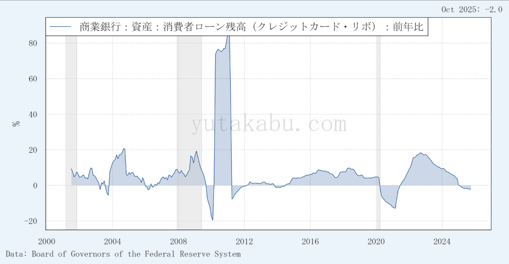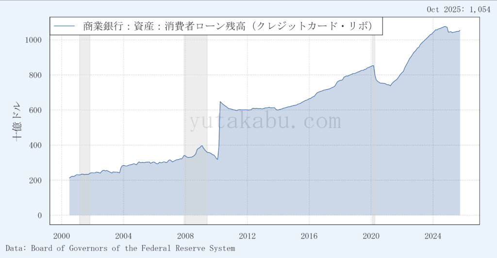 米国商業銀行が保有する消費者向け貸出のうち、クレジットカード残高およびその他のリボルビング信用枠に係る残高を示す指標。その推移は家計の短期的な借入需要や信用依存度の変化を示し、家計部門の財務状況・消費動向・金利環境の影響を分析する基礎となる。
