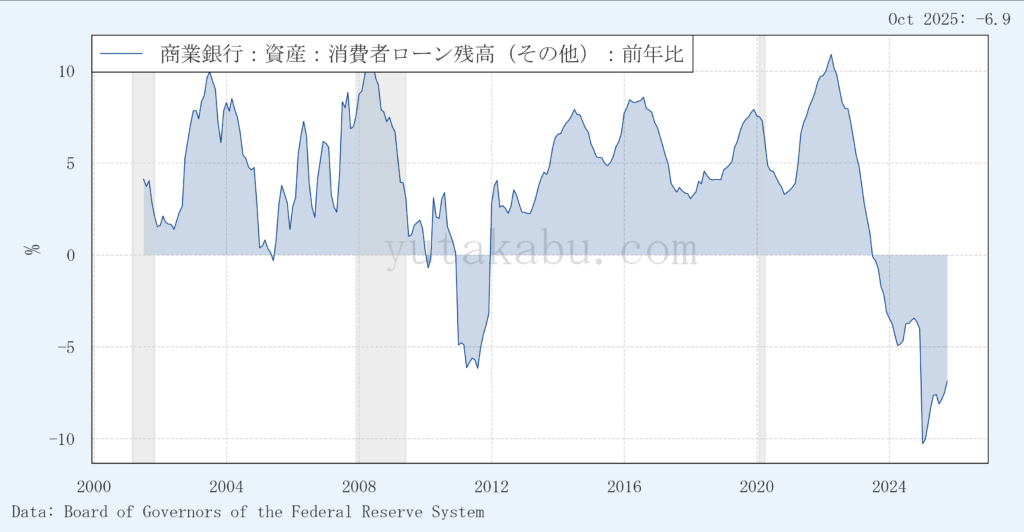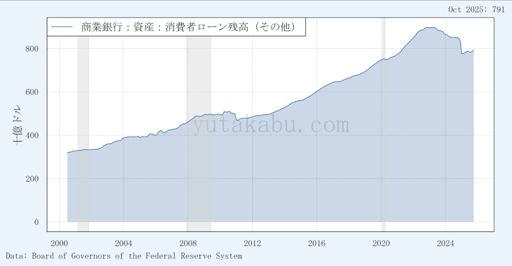 米国商業銀行が保有する消費者向け貸出のうち、クレジットカードなどのリボルビング信用を除くその他の消費者ローン(自動車ローンや個人ローンなど)の残高を示す指標。その推移は家計の耐久財購入や個人消費に関連する借入行動の変化を示し、家計の信用状況・所得環境・景気循環を分析する基礎となる。
