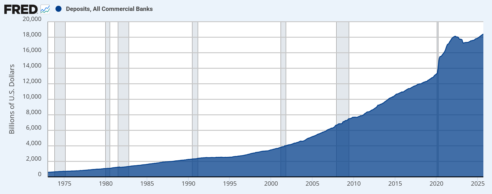 米国のすべての商業銀行に預けられている預金総額を集計した指標。預金者の資金動向や銀行の資金調達状況を示し、金融システムの安定性や資金流動性の分析に用いられる。