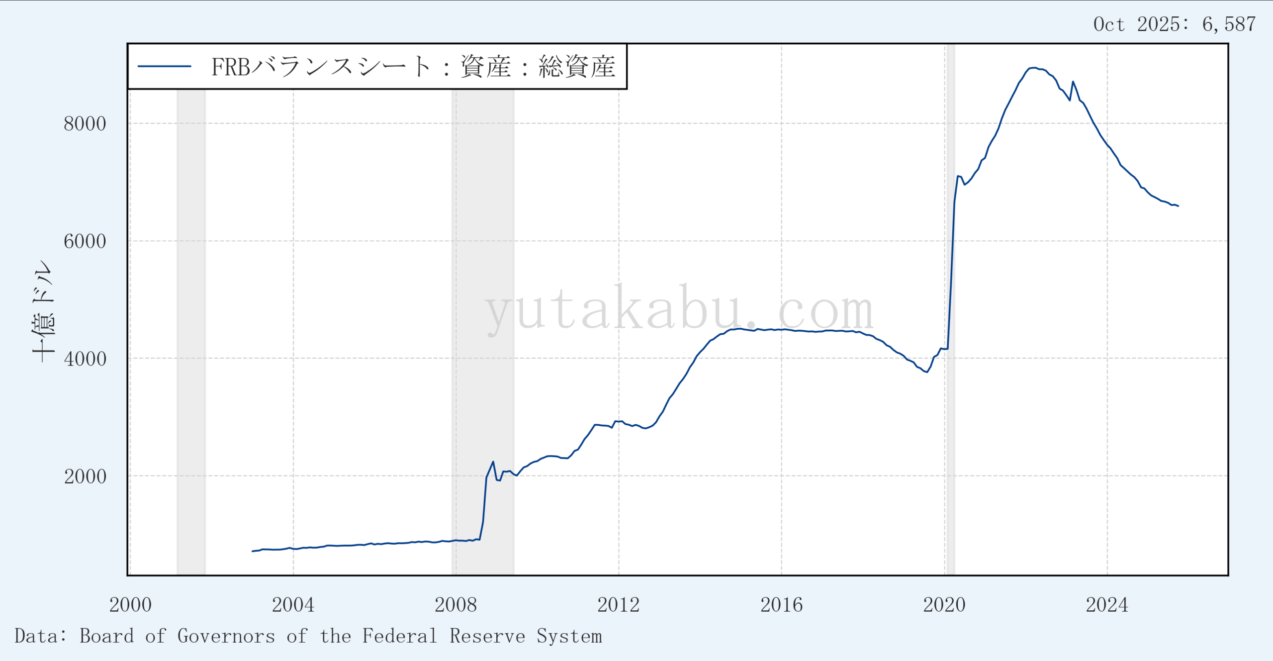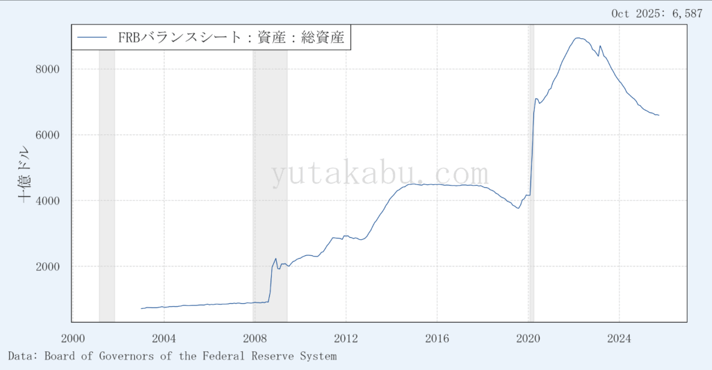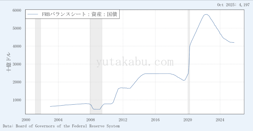 連邦準備銀行が市場から直接購入して保有している米国財務省証券の残高を示す指標。国債買い入れを通じた金融緩和や保有満期構成の変化がバランスシートにどの程度反映されているかを示す。