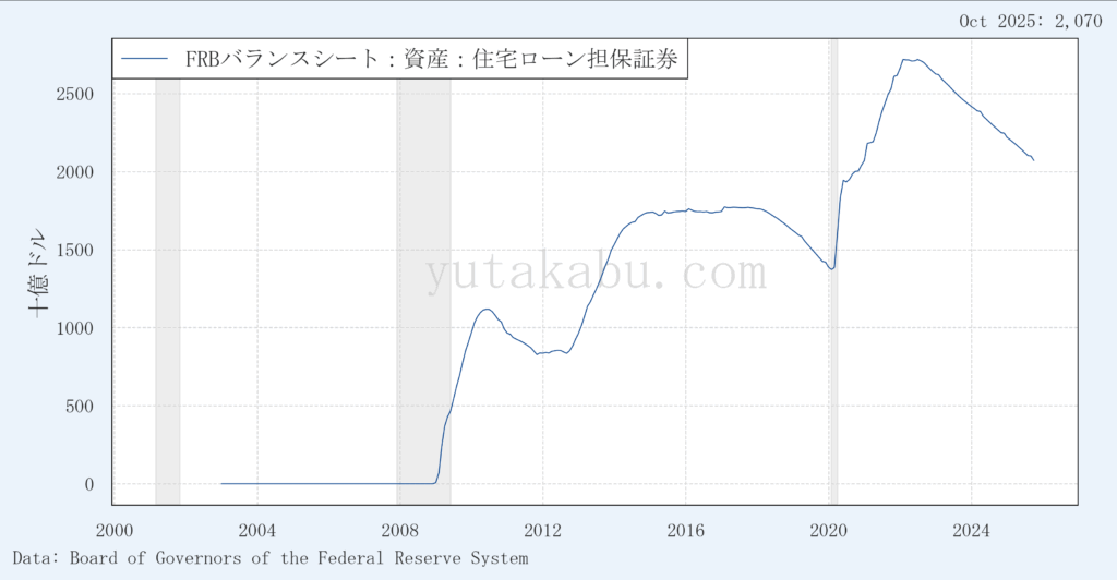 連邦準備銀行が住宅ローン担保証券(MBS)を市場から直接購入して保有している残高を示す指標。住宅金融市場への政策支援や量的緩和による資産買い入れの効果がバランスシートにどの程度反映されているかを示す。