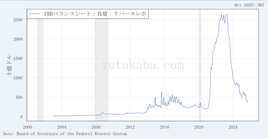 連邦準備銀行が金融機関や政府系機関に対して有価証券を貸し出し、同時に将来の買い戻しを約束して受け入れた資金の残高を示す指標。短期金利誘導や準備吸収のためにFRBが市場からどれだけ資金を吸収しているかを把握するために用いられ、その時点の流動性需要や金融政策運営の状況を示す。
