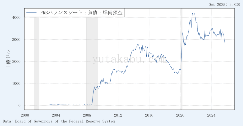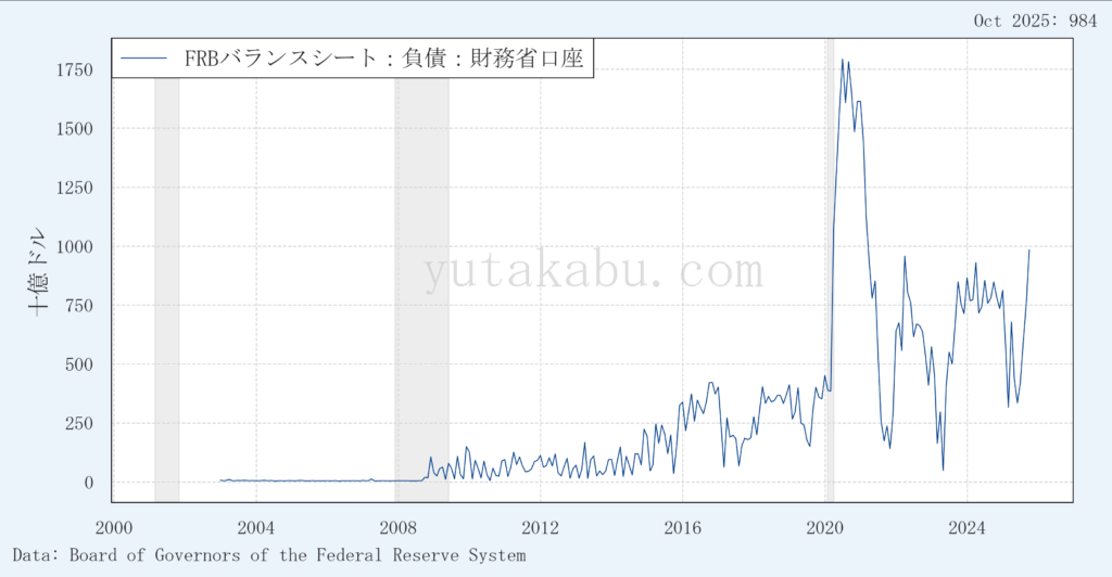 米国財務省が連邦準備銀行に保有する財務省一般勘定(TGA)の残高を示す指標。財務省の歳入・歳出に伴う資金需要や短期的な財政運営の状況がFRB負債としてどの程度積み上がっているかを示す。