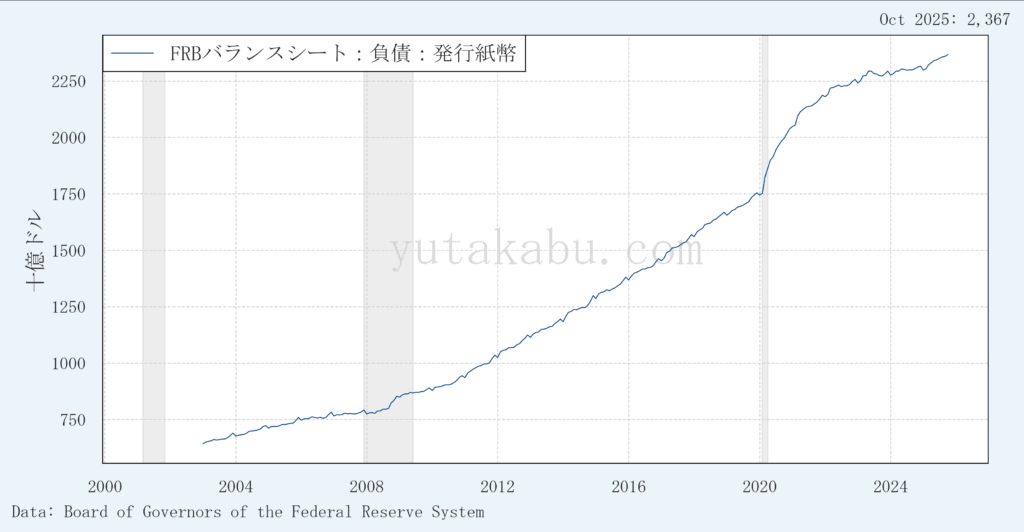 連邦準備銀行システムが発行した紙幣のうち、各連邦準備銀行が保有する自己保有分を差し引いた、市中に実質流通している連邦準備券残高を示す指標。紙幣需要や現金流通量の増減を捉える指標として用いられ、現金需要の季節性や経済活動に伴う通貨供給量の変化を示す。