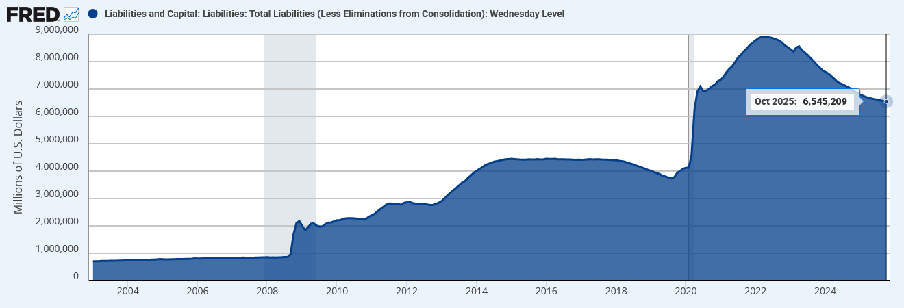 連邦準備銀行システム全体の負債総額を合算し、内部取引による重複を除去した水準を示す指標。紙幣発行残高・金融機関の準備預金・財務省口座など主要負債の総計がどの程度積み上がっているかを示す。