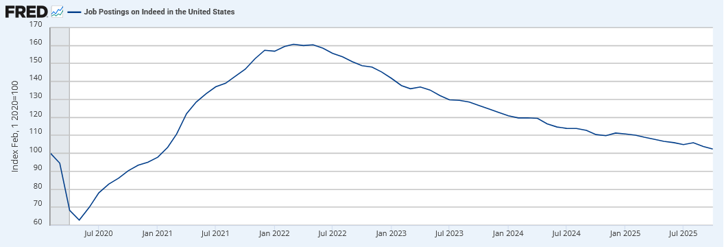 「Job Postings on Indeed in the United States(Indeed米国求人指数)」とは、求人サイトIndeedに掲載された米国内の求人件数をもとに、2020年2月1日を基準とした季節調整済みの求人動向を示す指数である。