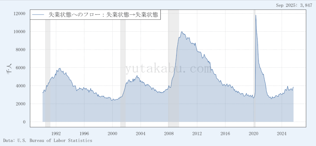 前月から当月にかけて失業状態のまま留まった人の数を示す指標。この数値は失業の長期化度合いや失業者の滞留状況を示すため、労働市場の改善速度や景気回復力を分析する際に用いられる。