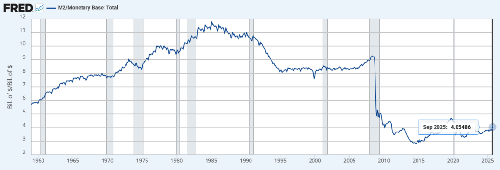 貨幣乗数(M2/マネタリーベース) 2025.10.302025.10.31 貨幣乗数(M2/マネタリーベース) FRBが供給する基礎マネーが、銀行の信用創造を通じてどの程度のマネーサプライ(M2)に拡大しているかを示す指標。数値の上昇は貸出や預金創造の活発化を、低下は金融機関の資金滞留や信用供給の鈍化を示す。