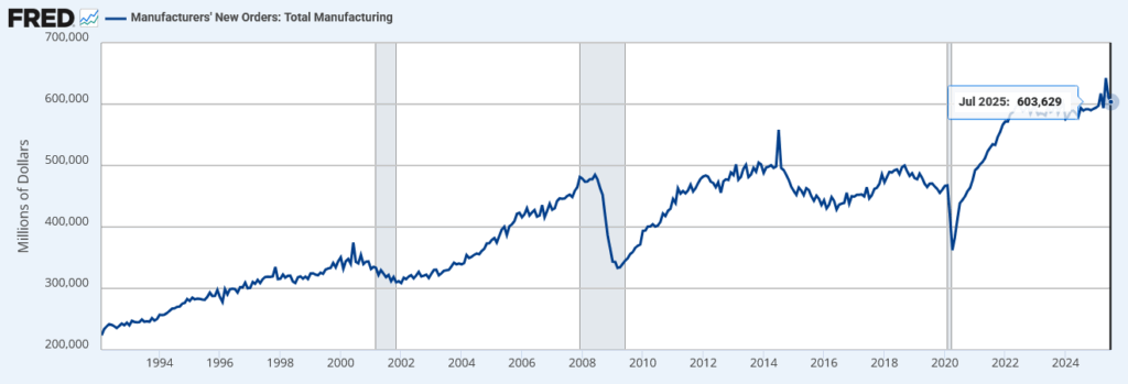 Manufacturers’ New Orders: Total Manufacturingは、米国商務省が公表する製造業全体の新規受注額を示す指標で、生産活動や需要動向を把握するために用いられる。受注額の増加は製造業の需要拡大や将来の生産増加を示し、減少は景気後退や需要減退の兆候を示す。