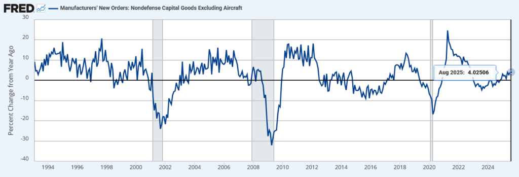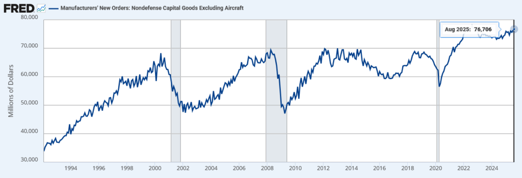 Manufacturers’ New Orders: Nondefense Capital Goods Excluding Aircraftは、米国製造業のうち防衛関連と航空機を除く設備投資向け資本財の新規受注額を示す指標で、企業の投資動向を測る代表的統計である。数値の増加は企業の設備投資意欲や将来の生産拡大を示し、減少は投資抑制や景気減速の兆候を示す。