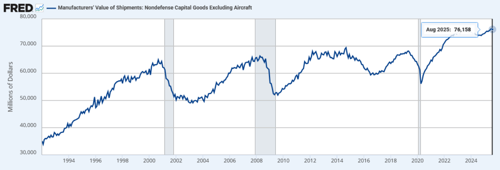 Manufacturers’ Value of Shipments: Nondefense Capital Goods Excluding Aircraftは、米国製造業における防衛関連と航空機を除く資本財の出荷額を示す指標で、企業の設備投資需要と生産活動の実勢を把握するために用いられる。数値の増加は設備投資の拡大や生産の活発化を示し、減少は需要の減退や景気の鈍化を示す。