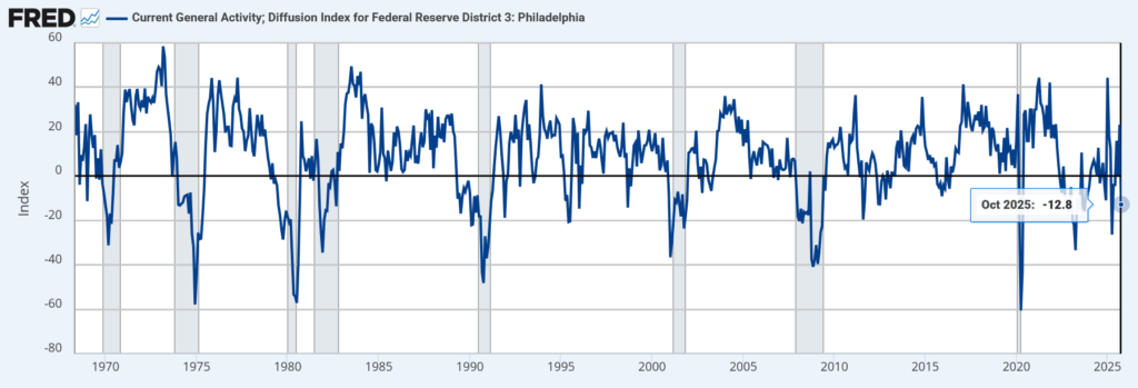 フィラデルフィア連銀の「現況総合指数(Current General Activity Index)」とは、製造業企業への月次調査に基づき、事業環境の拡大・縮小を示す拡散指数(増加報告率 − 減少報告率)を算出したものである。この指数が正の値をとると地域の製造業が全体として改善傾向にあり、負の値であれば縮小傾向にあることを示す。