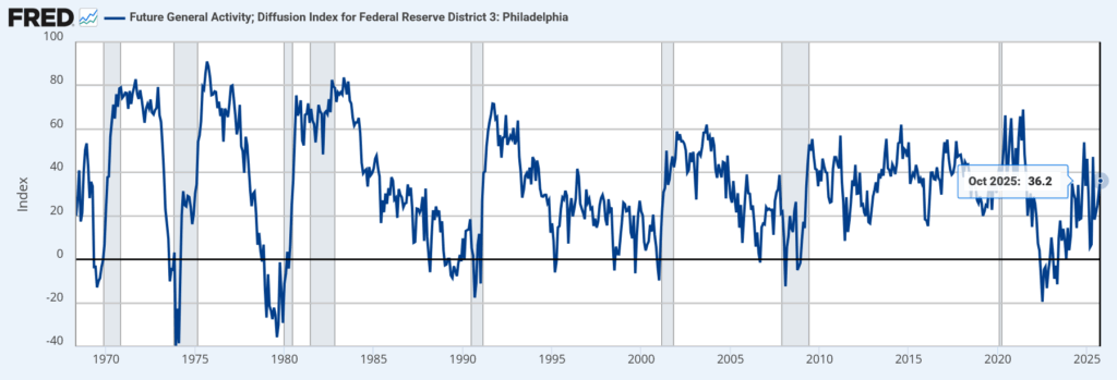 フィラデルフィア連銀の「期待総合指数(Future General Activity Index)」とは、製造業企業を対象とした月次調査において、今後6か月間の事業環境の拡大・縮小に関する予想を示す拡散指数(増加報告率 − 減少報告率)である。この指数が正の値をとる場合には企業群が将来的な改善を見込んでおり、負の値であれば将来にも縮小傾向を予想していることを意味する。