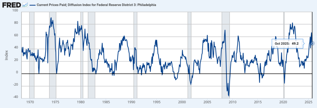 フィラデルフィア連銀の「支払価格指数(Prices Paid Index)」とは、製造業企業を対象とした調査で、原材料・中間財などの調達コストの上昇・低下を示す拡散指数(増加報告率 − 減少報告率)である。この指数が正の値をとる場合には、調達コストが全体として上昇傾向にあることを示し、逆に負の値であればコスト低下傾向を示す。