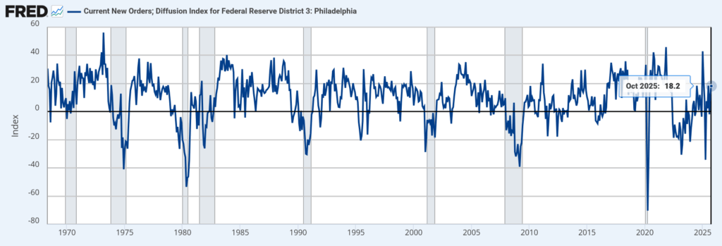 フィラデルフィア連銀の「新規受注指数(Current New Orders Index)」とは、製造業企業を対象とした月次調査において、前月比で新たに受注した量の増減を示す拡散指数(増加報告率 − 減少報告率)である。この指数が正の値をとる場合には、地域製造業において全体として新規受注が拡大している傾向があることを示し、負の値であれば受注が縮小傾向であることを意味する。