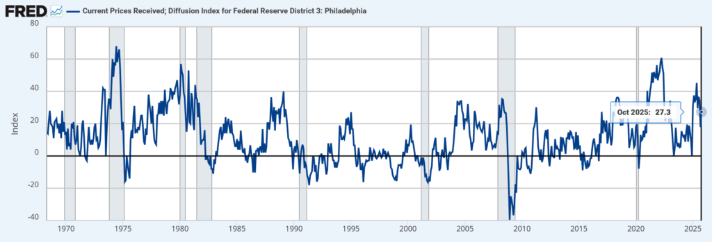フィラデルフィア連銀の「受取価格指数(Prices Received Index)」とは、製造業企業を対象とした月次調査において、自社製品の販売価格の変動を示す拡散指数(値上げ報告率 - 値下げ報告率)である。この指数が正の値をとると、企業群が製品販売価格の引き上げ圧力を受けている傾向を示し、負の値であれば販売価格の低下圧力が強まっていることを意味する。