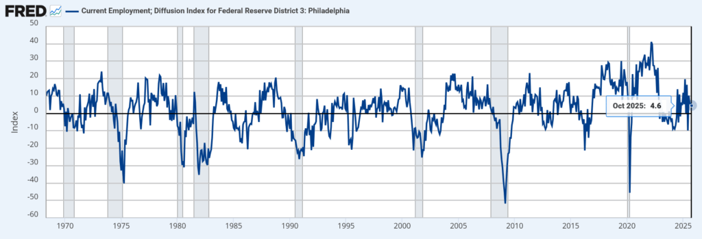 フィラデルフィア連銀の「雇用指数(Employment Index)」とは、製造業企業を対象とした月次調査において、前月比で従業員数の増減を示す拡散指数(増加報告率 − 減少報告率)である。この指数が正の値を示すと、企業群が雇用を増加させている傾向を意味し、負の値であれば雇用縮小の傾向を示す。