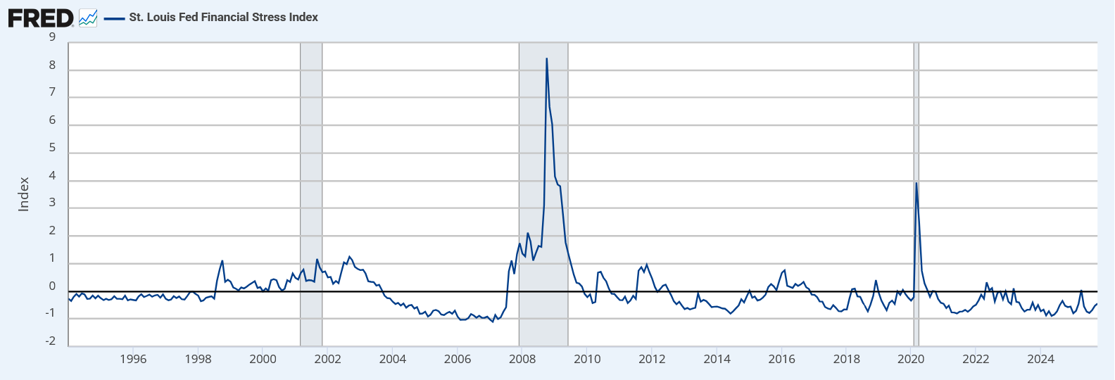 金利スプレッドやボラティリティなど18の金融市場データから、市場の緊張度を総合的に測定する指標。数値が正のときは「平均より金融市場のストレスが高い=引き締まった状況」、負のときは「平均より低い=緩やかな状況」を示す。